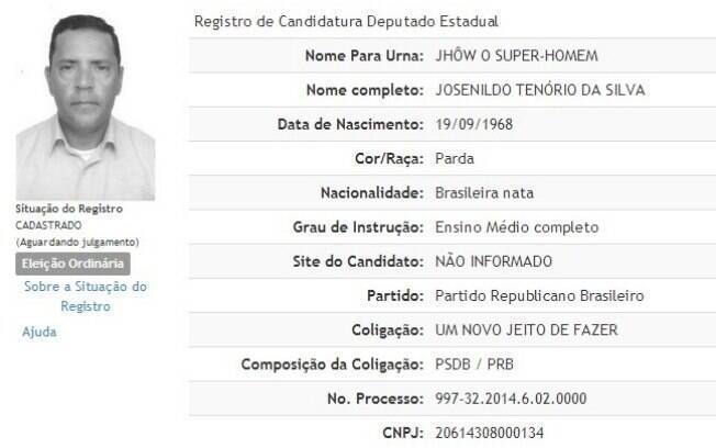 'Jhôw o Super-Homem': o comerciário Josenildo Tenório da Silva (PRB/AL) é candidato a deputado estadual. Foto: Reprodução/TSE