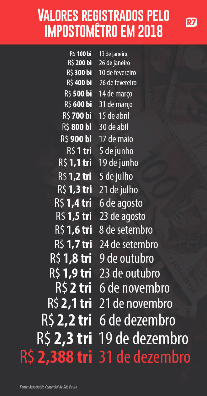O valor corresponde ao total de impostos, taxas, multas e contribuições que a população brasileira pagou desde o início de 2018. Para todo o ano a projeção é de que o montante chegue a R$ 2,388 trilhões.