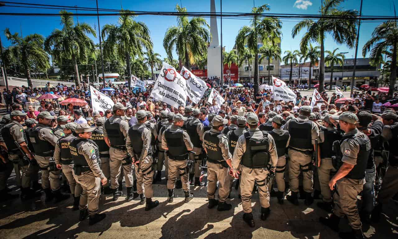 Servidores tentam furar bloqueio de policiais militares na entrada da Assembleia Legislativa